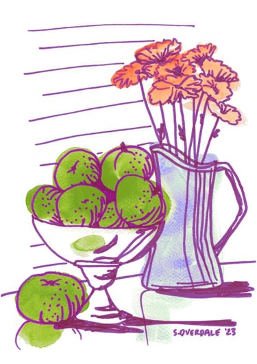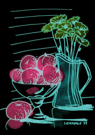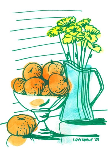 When I painted this bright bowl of oranges, and scanned the art to make a digital print, I had to do some colour correction to the oranges. As I worked on the colours through a process of trial and error, I kept thinking of that sentence, and thus 'mijn sinaasappels', plus several variations of 'mijn sinaasappels zijn niet oranje', were born.